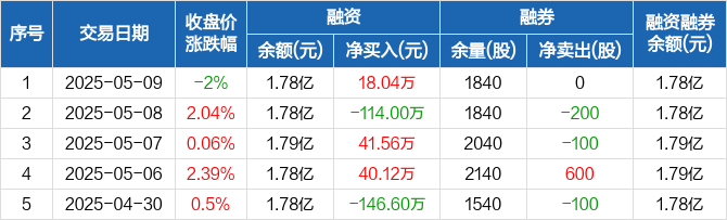 融资方面,当日融资买入766.39万元,融资偿还748.36万元,融资净买入18.04万元。融券方面,融券卖出100股,融券偿还100股,融券余量1840股,融券余额26.36万元。融资融券余额合计1.78亿元。
