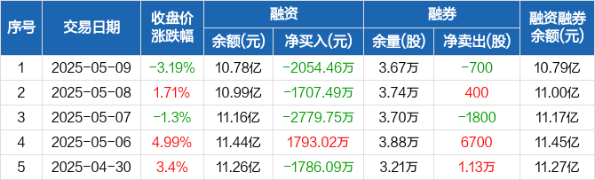 融资方面,当日融资买入7628.61万元,融资偿还9683.07万元,融资净偿还2054.46万元,连续3日净偿还累计6541.71万元。融券方面,融券卖出2400股,融券偿还3100股,融券余量3.67万股,融券余额101.29万元。融资融券余额合计10.79亿元。