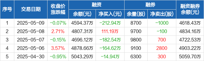 融资方面,当日融资买入158.46万元,融资偿还371.4万元,融资净偿还212.94万元。融券方面,融券卖出0股,融券偿还1000股,融券余量8700股,融券余额24.06万元。融资融券余额合计4618.43万元。