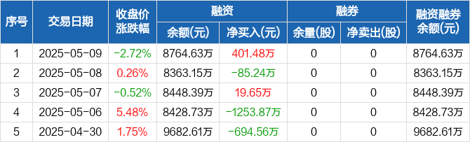 融资方面,当日融资买入942.29万元,融资偿还540.81万元,融资净买入401.48万元。融券方面,融券卖出0股,融券偿还0股,融券余量0股,融券余额0元。融资融券余额合计8764.63万元。