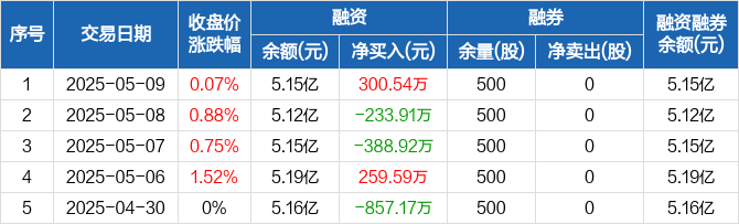融资方面,当日融资买入1399.75万元,融资偿还1099.21万元,融资净买入300.54万元。融券方面,融券卖出0股,融券偿还0股,融券余量500股,融券余额7495元。融资融券余额合计5.15亿元。