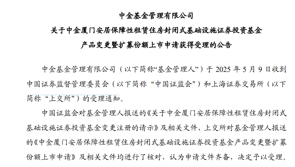 5月10日,中金基金发布公告称,中金厦门安居REIT已正式向证监会提交基金变更注册请示,向上海证券交易所提交基金产品变更暨扩募份额上市申请,并获得受理,标志着中金厦门安居REIT扩募进入加速推进阶段。