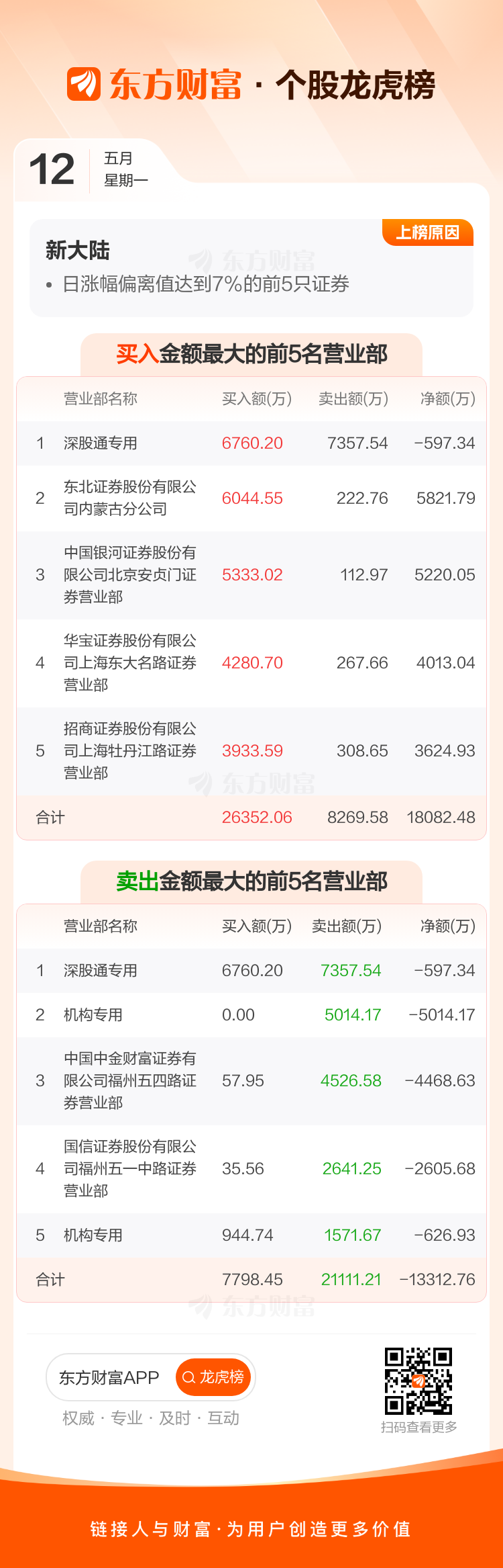 交易所2025年5月12日公布的交易公开信息显示,新大陆因成为日涨幅偏离值达到7%的前5只证券上榜。新大陆当日收报31.35元,涨跌幅10.00%,偏离值8.30%,换手率4.95%,成交额15.25亿。