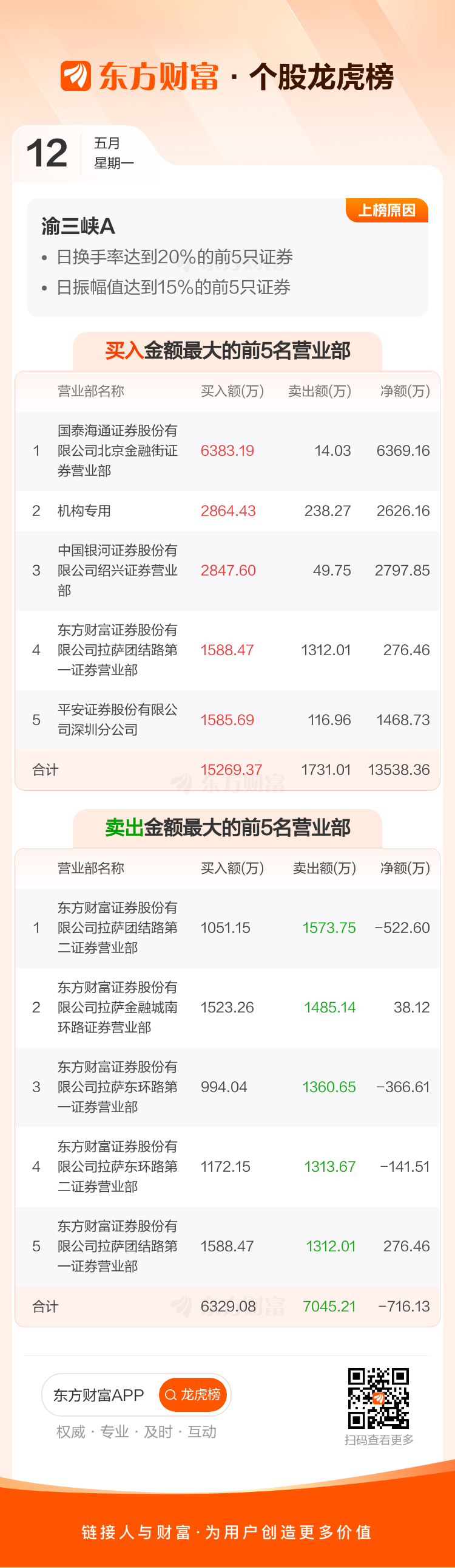 交易所2025年5月12日公布的交易公开信息显示,渝三峡A因成为日换手率达到20%的前5只证券、日振幅值达到15%的前5只证券上榜。渝三峡A当日收报9.96元,涨跌幅7.10%,偏离值38.36%,换手率38.36%,成交额15.41亿。