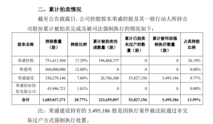 截至公告披露日,荣盛控股及其一致行动人累计被拍卖完成的股份数量为2.24亿股。