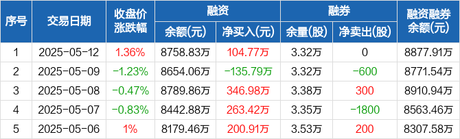 融资方面,当日融资买入491.17万元,融资偿还386.4万元,融资净买入104.77万元。融券方面,融券卖出0股,融券偿还0股,融券余量3.32万股,融券余额119.07万元。融资融券余额合计8877.91万元。