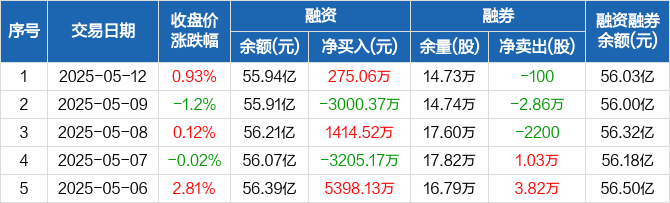 中科曙光融资融券信息显示,2025年5月12日融资净买入275.06万元;融资余额55.94亿元,较前一日增加0.05%。