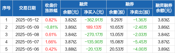 融资方面,当日融资买入1283.02万元,融资偿还1645.93万元,融资净偿还362.91万元。融券方面,融券卖出0股,融券偿还1.36万股,融券余量9.29万股,融券余额45.71万元。融资融券余额合计3.83亿元。