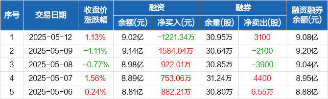 融资方面,当日融资买入2366.77万元,融资偿还3588.11万元,融资净偿还1221.34万元。融券方面,融券卖出7100股,融券偿还4000股,融券余量30.95万股,融券余额638.72万元。融资融券余额合计9.08亿元。