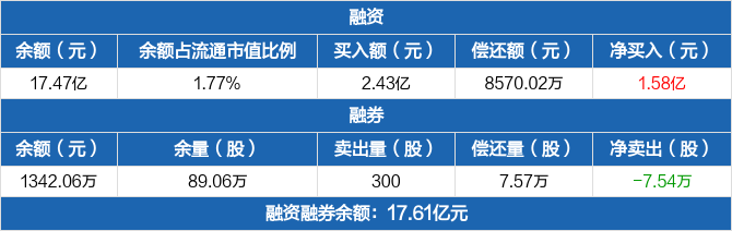 融资方面,当日融资买入2.43亿元,融资偿还8570.02万元,融资净买入1.58亿元,净买入额创历史新高,净买入额两市排名第七。融券方面,融券卖出300股,融券偿还7.57万股,融券余量89.06万股,融券余额1342.06万元。融资融券余额合计17.61亿元。