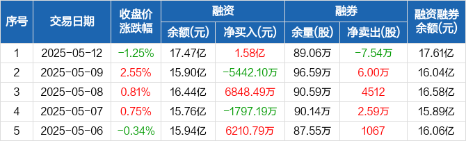 杭州银行融资融券信息显示,2025年5月12日融资净买入1.58亿元;融资余额17.47亿元,创历史新高,较前一日增加9.92%。
