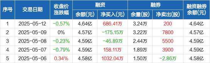 融资方面,当日融资买入1480.49万元,融资偿还794.08万元,融资净买入686.41万元。融券方面,融券卖出3900股,融券偿还3700股,融券余量3.24万股,融券余额28.35万元。融资融券余额合计4.64亿元。