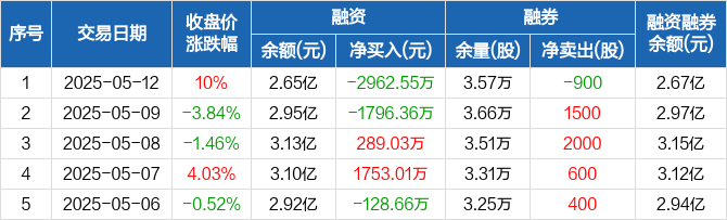 鸿远电子融资融券信息显示,2025年5月12日融资净偿还2962.55万元;融资余额2.65亿元,较前一日下降10.05%