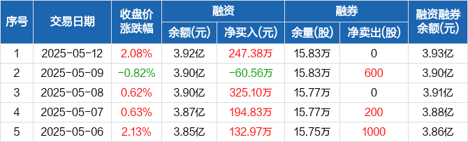 融资方面,当日融资买入742.01万元,融资偿还494.63万元,融资净买入247.38万元。融券方面,融券卖出200股,融券偿还200股,融券余量15.83万股,融券余额77.73万元。融资融券余额合计3.93亿元。