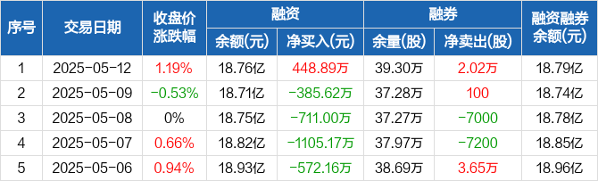 融资方面,当日融资买入3787.3万元,融资偿还3338.41万元,融资净买入448.89万元。融券方面,融券卖出3.18万股,融券偿还1.16万股,融券余量39.3万股,融券余额299.86万元。融资融券余额合计18.79亿元。