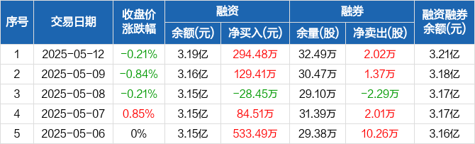 融资方面,当日融资买入426.64万元,融资偿还132.17万元,融资净买入294.48万元。融券方面,融券卖出2.81万股,融券偿还7900股,融券余量32.49万股,融券余额153.03万元。融资融券余额合计3.21亿元。