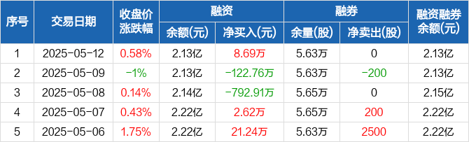融资方面,当日融资买入403.68万元,融资偿还394.99万元,融资净买入8.69万元。融券方面,融券卖出0股,融券偿还0股,融券余量5.63万股,融券余额78.48万元。融资融券余额合计2.13亿元。
