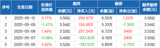 融资方面,当日融资买入1021.39万元,融资偿还811.42万元,融资净买入209.97万元,连续3日净买入累计621.57万元。融券方面,融券卖出1.3万股,融券偿还800股,融券余量6.55万股,融券余额39.69万元。融资融券余额合计3.56亿元。