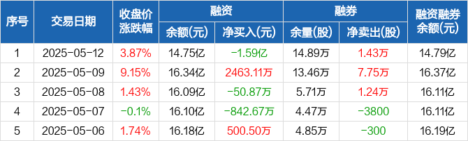 国轩高科融资融券信息显示,2025年5月12日融资净偿还1.59亿元;融资余额14.75亿元,较前一日下降9.72%。