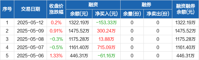 融资方面,当日融资买入773.43万元,融资偿还926.76万元,融资净偿还153.33万元。融券方面,融券卖出0份,融券偿还0份,融券余量0份,融券余额0元。融资融券余额合计1322.19万元。