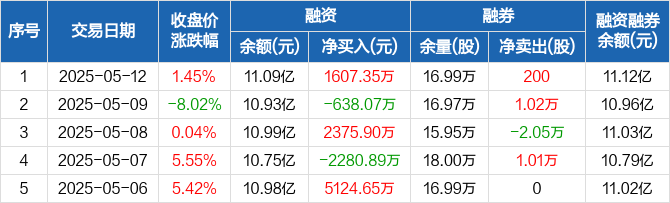 融资方面,当日融资买入1.64亿元,融资偿还1.48亿元,融资净买入1607.35万元。融券方面,融券卖出200股,融券偿还0股,融券余量16.99万股,融券余额367.83万元。融资融券余额合计11.12亿元。