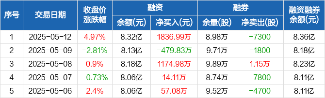 华大基因融资融券信息显示,2025年5月12日融资净买入1836.99万元;融资余额8.32亿元,较前一日增加2.26%。