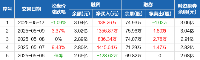 融资方面,当日融资买入3234.36万元,融资偿还3096.09万元,融资净买入138.26万元,连续4日净买入累计3747.11万元。融券方面,融券卖出300股,融券偿还1.06万股,融券余量74.93万股,融券余额204.56万元。融资融券余额合计3.06亿元。