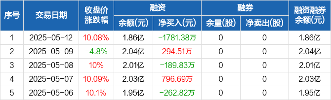 融资方面,当日融资买入6028.09万元,融资偿还7809.47万元,融资净偿还1781.38万元。融券方面,融券卖出0股,融券偿还0股,融券余量0股,融券余额0元。融资融券余额合计1.86亿元。