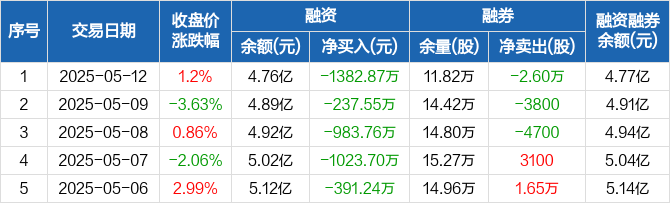 融资方面,当日融资买入3603.9万元,融资偿还4986.78万元,融资净偿还1382.87万元,连续6日净偿还累计7258.43万元。融券方面,融券卖出0股,融券偿还2.6万股,融券余量11.82万股,融券余额149.29万元。融资融券余额合计4.77亿元。