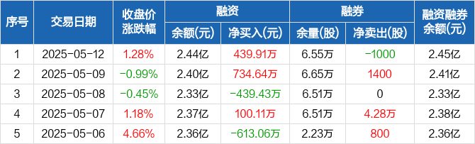 融资方面,当日融资买入1433.68万元,融资偿还993.77万元,融资净买入439.91万元。融券方面,融券卖出1000股,融券偿还2000股,融券余量6.55万股,融券余额72.77万元。融资融券余额合计2.45亿元。