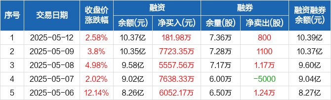 融资方面,当日融资买入2.5亿元,融资偿还2.48亿元,融资净买入181.98万元,连续5日净买入累计2.72亿元。融券方面,融券卖出1100股,融券偿还300股,融券余量7.36万股,融券余额216.38万元。融资融券余额合计10.39亿元。