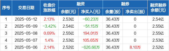 融资方面,当日融资买入818.88万元,融资偿还879.12万元,融资净偿还60.23万元。融券方面,融券卖出0股,融券偿还0股,融券余量36.43万股,融券余额52.46万元。融资融券余额合计2.54亿元。