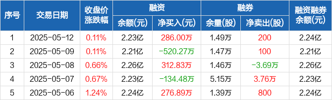 融资方面,当日融资买入563.82万元,融资偿还277.81万元,融资净买入286万元。融券方面,融券卖出200股,融券偿还0股,融券余量1.49万股,融券余额13.59万元。融资融券余额合计2.24亿元。
