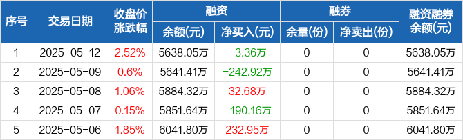 融资方面,当日融资买入482.82万元,融资偿还486.18万元,融资净偿还3.36万元。融券方面,融券卖出0份,融券偿还0份,融券余量0份,融券余额0元。融资融券余额合计5638.05万元。