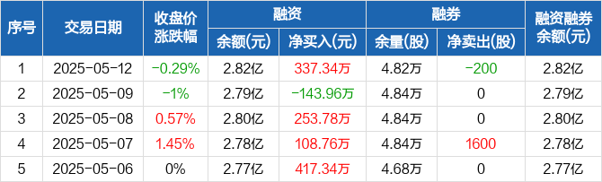 融资方面,当日融资买入709.45万元,融资偿还372.12万元,融资净买入337.34万元。融券方面,融券卖出0股,融券偿还200股,融券余量4.82万股,融券余额33.4万元。融资融券余额合计2.82亿元。