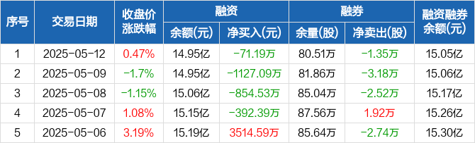 兴森科技融资融券信息显示,2025年5月12日融资净偿还71.19万元;融资余额14.95亿元,较前一日下降0.05%。