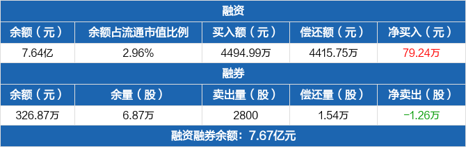 融资方面,当日融资买入4494.99万元,融资偿还4415.75万元,融资净买入79.24万元。融券方面,融券卖出2800股,融券偿还1.54万股,融券余量6.87万股,融券余额326.87万元。融资融券余额合计7.67亿元。