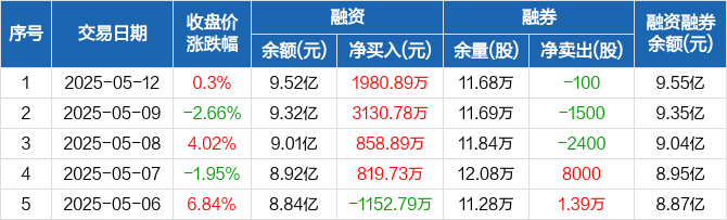 融资方面,当日融资买入1.03亿元,融资偿还8345.12万元,融资净买入1980.89万元,连续4日净买入累计6790.29万元。融券方面,融券卖出1000股,融券偿还1100股,融券余量11.68万股,融券余额274.36万元。融资融券余额合计9.55亿元。