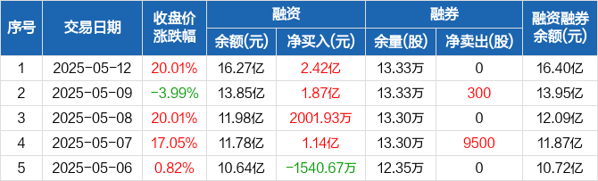 中航成飞融资融券信息显示,2025年5月12日融资净买入2.42亿元;融资余额16.27亿元,较前一日增加17.5%。
