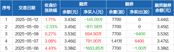 融资方面,当日融资买入1643.48万元,融资偿还1788.57万元,融资净偿还145.09万元。融券方面,融券卖出0股,融券偿还0股,融券余量7700股,融券余额27.95万元。融资融券余额合计3.44亿元。