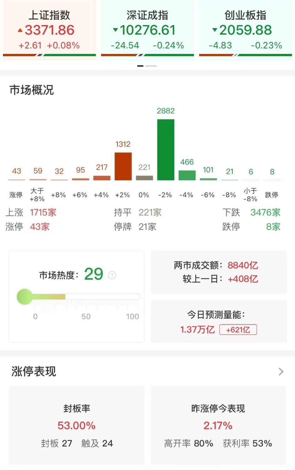 财联社5月13日电,市场早盘高开低走,三大指数涨跌不一。沪深两市半日成交额8840亿,较上个交易日放量408亿。盘面上热点较为杂乱,个股跌多涨少,全市场超3400只个股下跌。从板块来看,光伏概念股集体走强,欧晶科技涨停。银行股逆势活跃,浦发银行等再创历史新高。化工股局部走高,红墙股份等涨停。下跌方面,军工股集体调整,中航成飞等多股跌超5%。板块方面,光伏、港口、银行、化工等板块涨幅居前,军工、小金属、民爆、稀土等板块跌幅居前。截至收盘,沪指涨0.08%,深成指跌0.24%,创业板指跌0.23%。