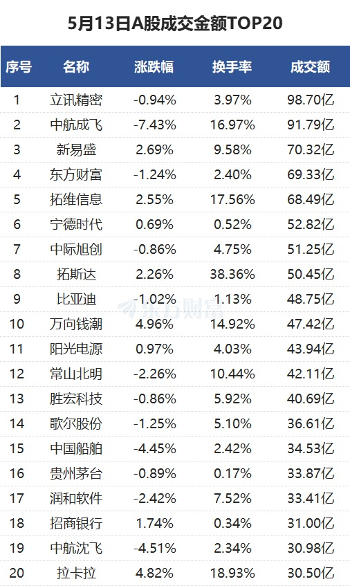 5月13日,上证指数涨0.17%,收报3374.87点;深证成指跌0.13%,收报10288.08点;创业板指跌0.12%,收报2062.26点。