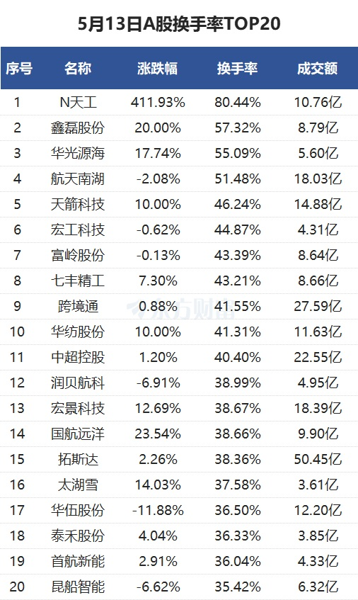 当天换手率最高的个股为N天工,全天换手率80.44%。鑫磊股份紧随其后,全天换手率57.32%。