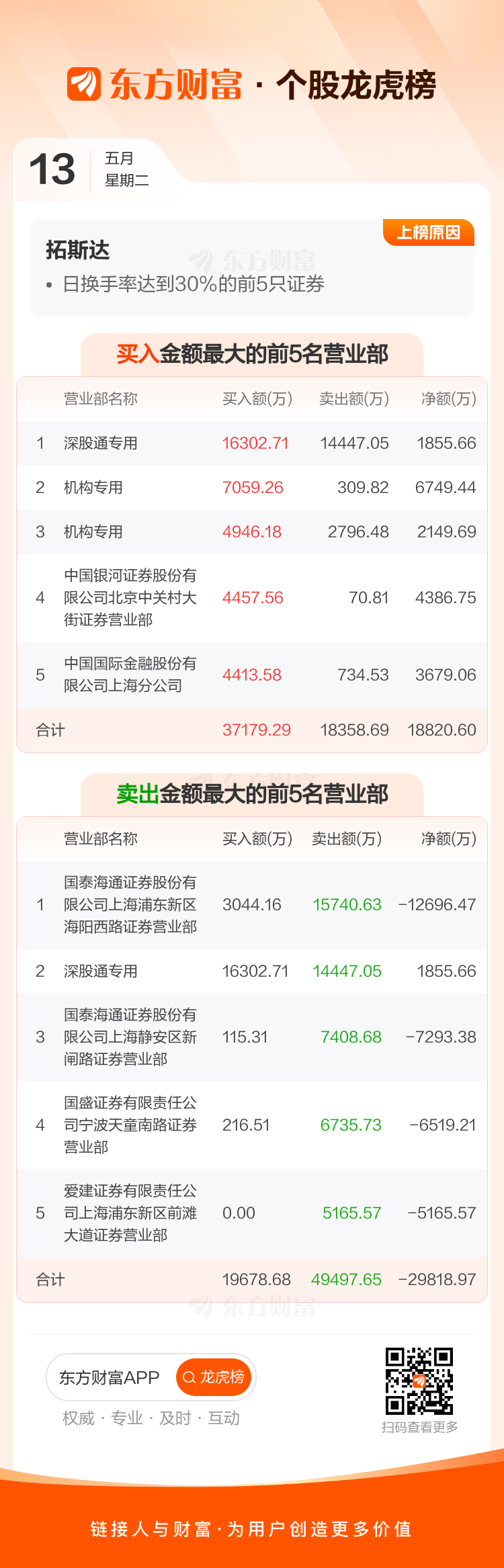 交易所2025年5月13日公布的交易公开信息显示,拓斯达因成为日换手率达到30%的前5只证券上榜。拓斯达当日收报38.02元,涨跌幅2.26%,偏离值39.01%,换手率38.36%,成交额50.45亿。