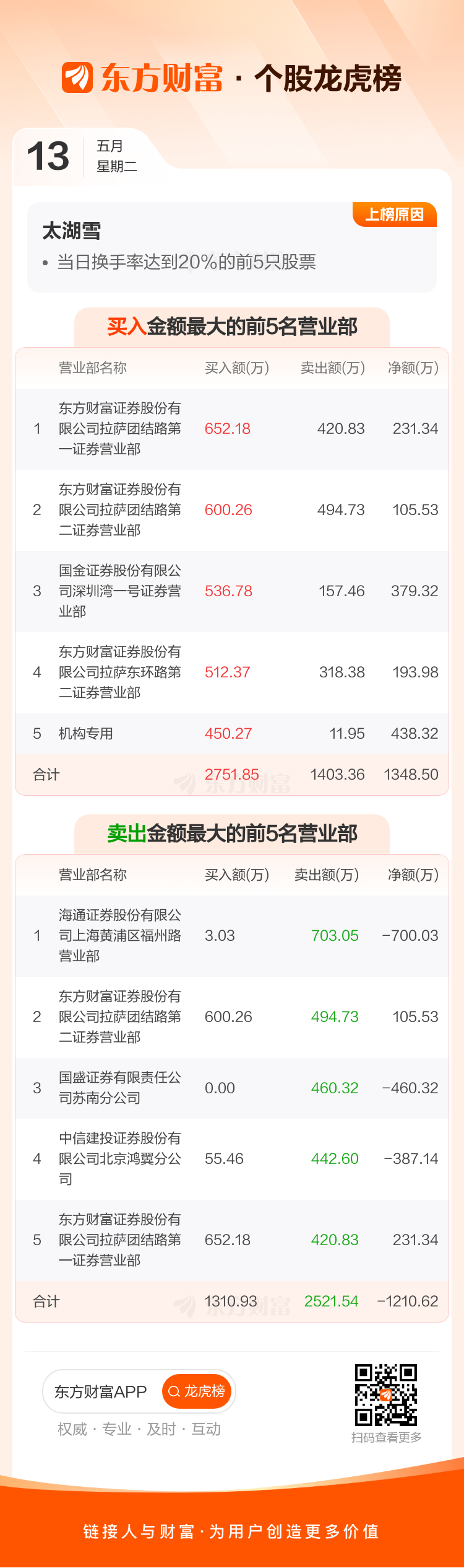 交易所2025年5月13日公布的交易公开信息显示,太湖雪因成为当日换手率达到20%的前5只股票上榜。太湖雪当日收报31.69元,涨跌幅14.03%,偏离值37.58%,换手率37.58%,成交额3.61亿。