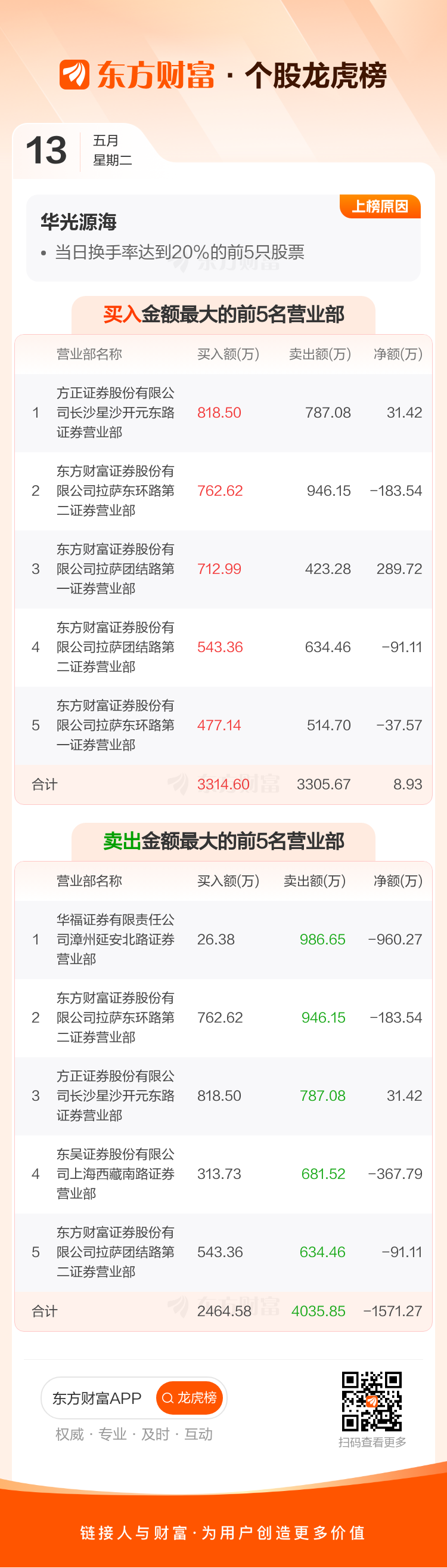 交易所2025年5月13日公布的交易公开信息显示,华光源海因成为当日换手率达到20%的前5只股票上榜。华光源海当日收报29.87元,涨跌幅17.74%,偏离值55.09%,换手率55.09%,成交额5.60亿。