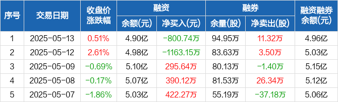 融资方面,当日融资买入1275.26万元,融资偿还2076万元,融资净偿还800.74万元。融券方面,融券卖出12.4万股,融券偿还1.08万股,融券余量94.95万股,融券余额563.05万元。融资融券余额合计4.96亿元。