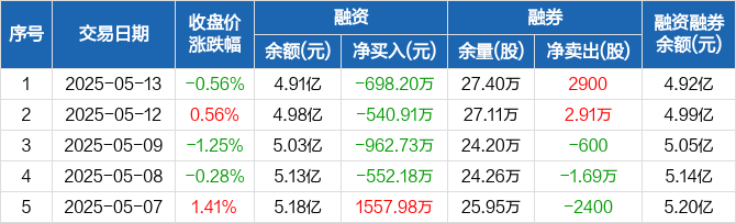 融资方面,当日融资买入1024.58万元,融资偿还1722.78万元,融资净偿还698.2万元,连续4日净偿还累计2754.02万元。融券方面,融券卖出3300股,融券偿还400股,融券余量27.4万股,融券余额194.27万元。融资融券余额合计4.92亿元。