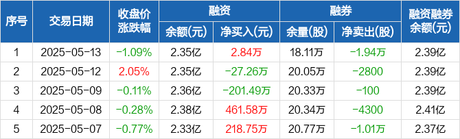 融资方面,当日融资买入454.96万元,融资偿还452.12万元,融资净买入2.84万元。融券方面,融券卖出3600股,融券偿还2.3万股,融券余量18.11万股,融券余额329.78万元。融资融券余额合计2.39亿元。