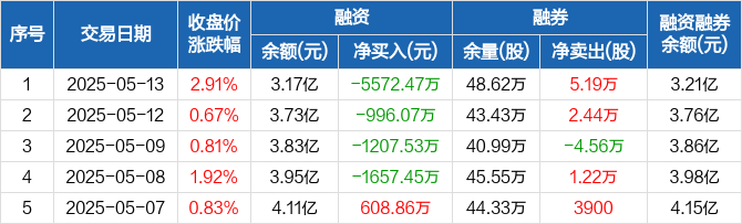 常熟银行融资融券信息显示,2025年5月13日融资净偿还5572.47万元;融资余额3.17亿元,较前一日下降14.95%。